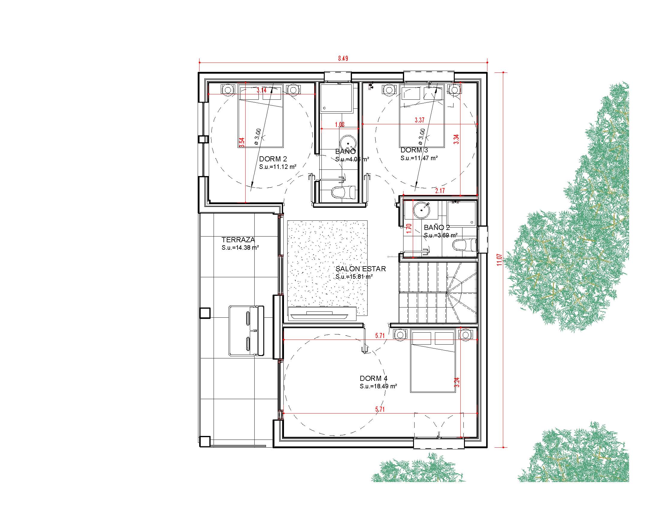 Dos plantas con cuatro dormitorios, dos baños, salon cocina, terrazas y piscina en la parcela.