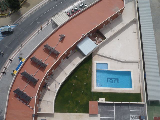 La planta baja la ocupa una zona comercial siguiendo la forma de la calle Marina Baixa y las zonas comunes de la edificación con piscina y área de aparcamiento